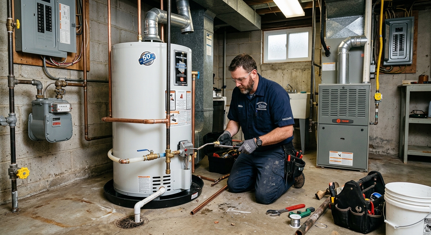 Tank and tankless water heater replacement by licensed Forks plumbers. We remove the old unit, install the new heater, connect gas or electrical supply, adjust temperature settings and test thoroughly. Most replacements completed in 2-4 hours.